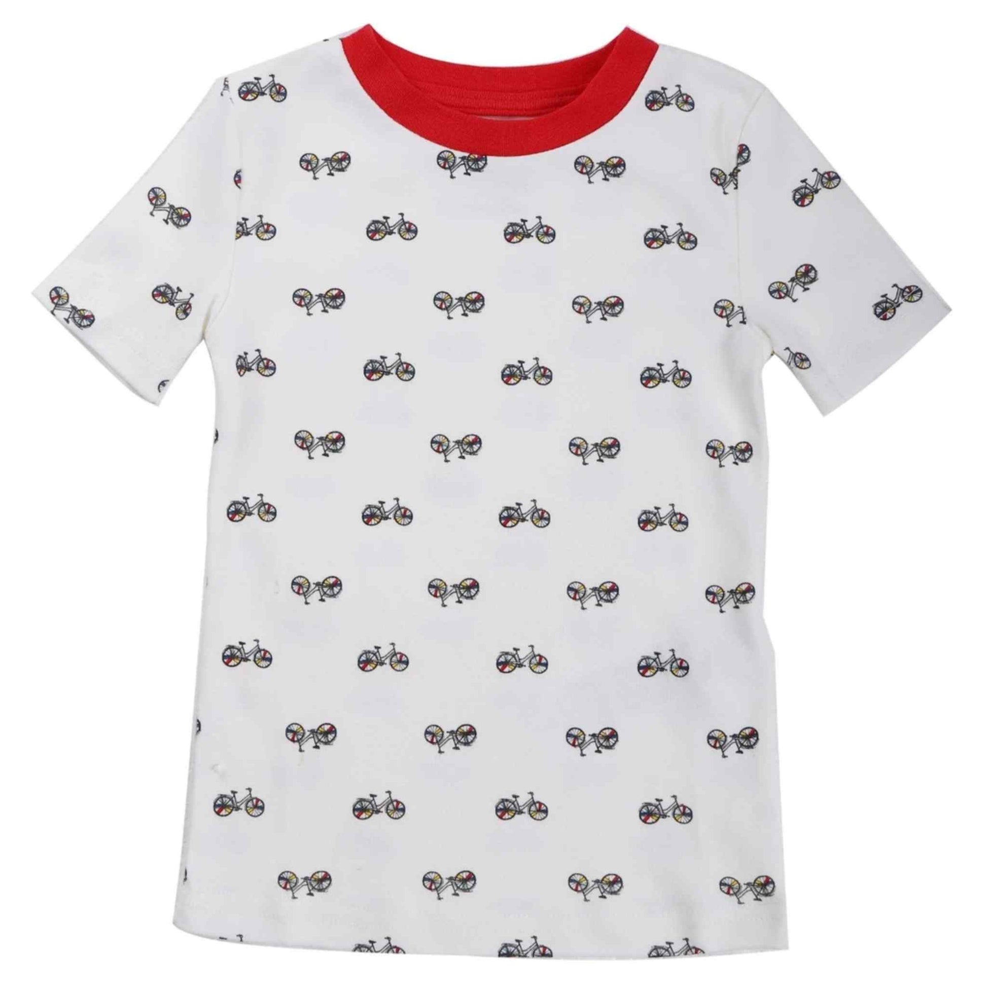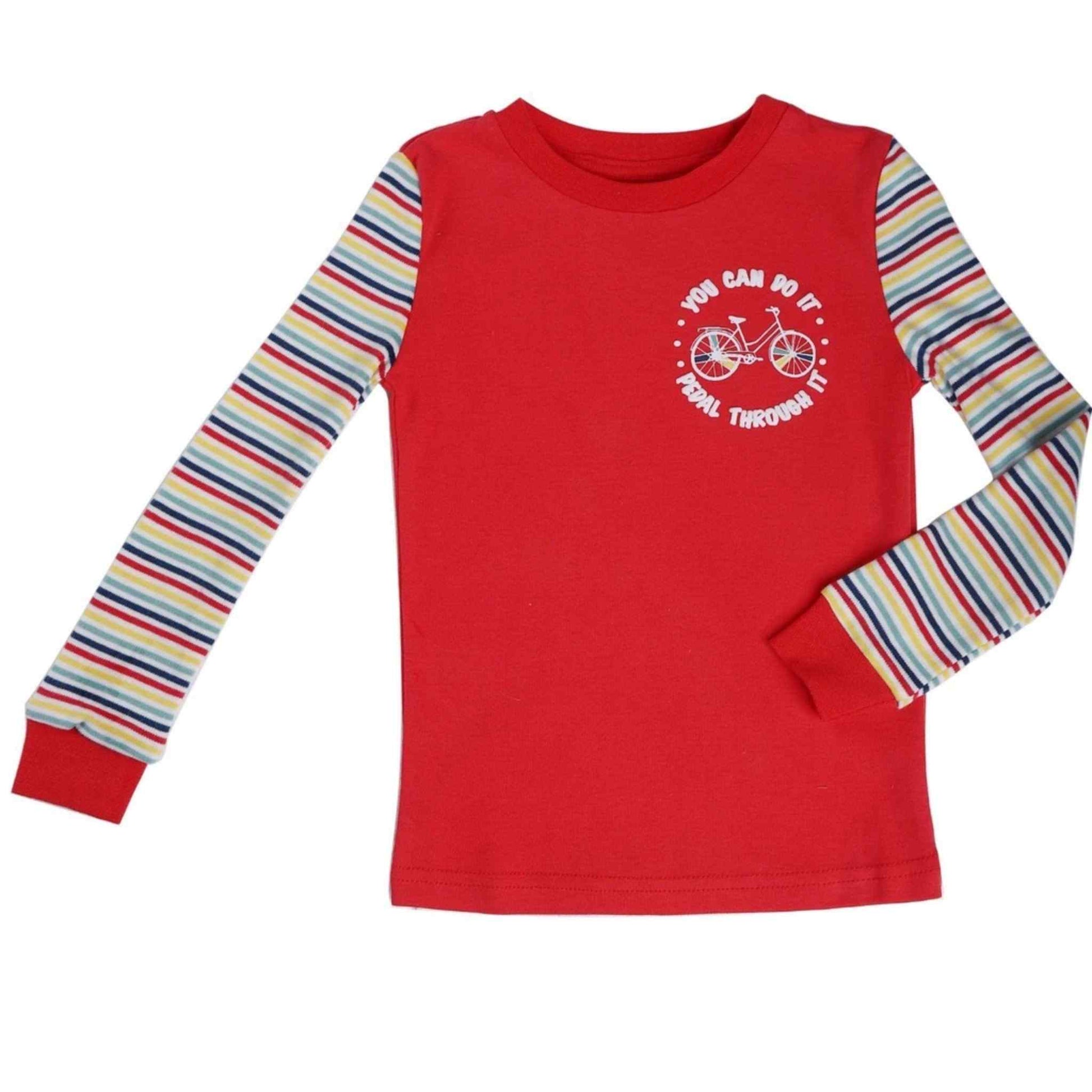 - Prints: Bicycle print, rainbow stripes and red hues.