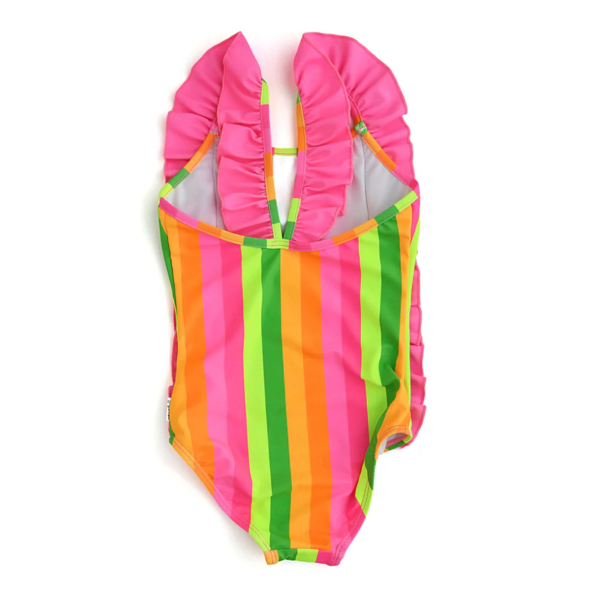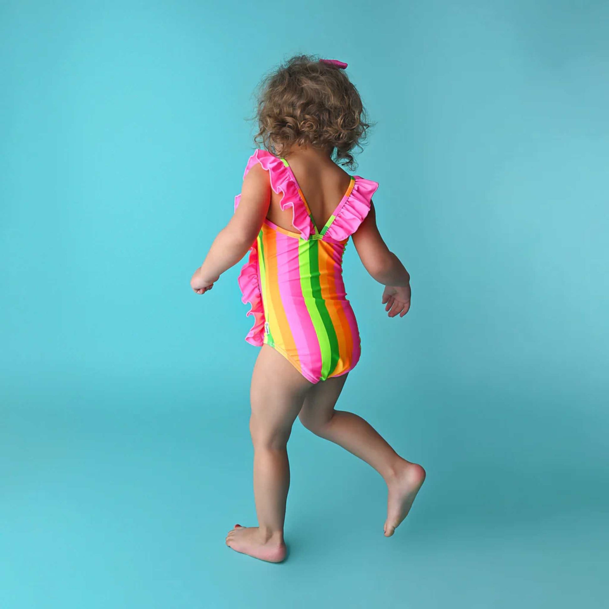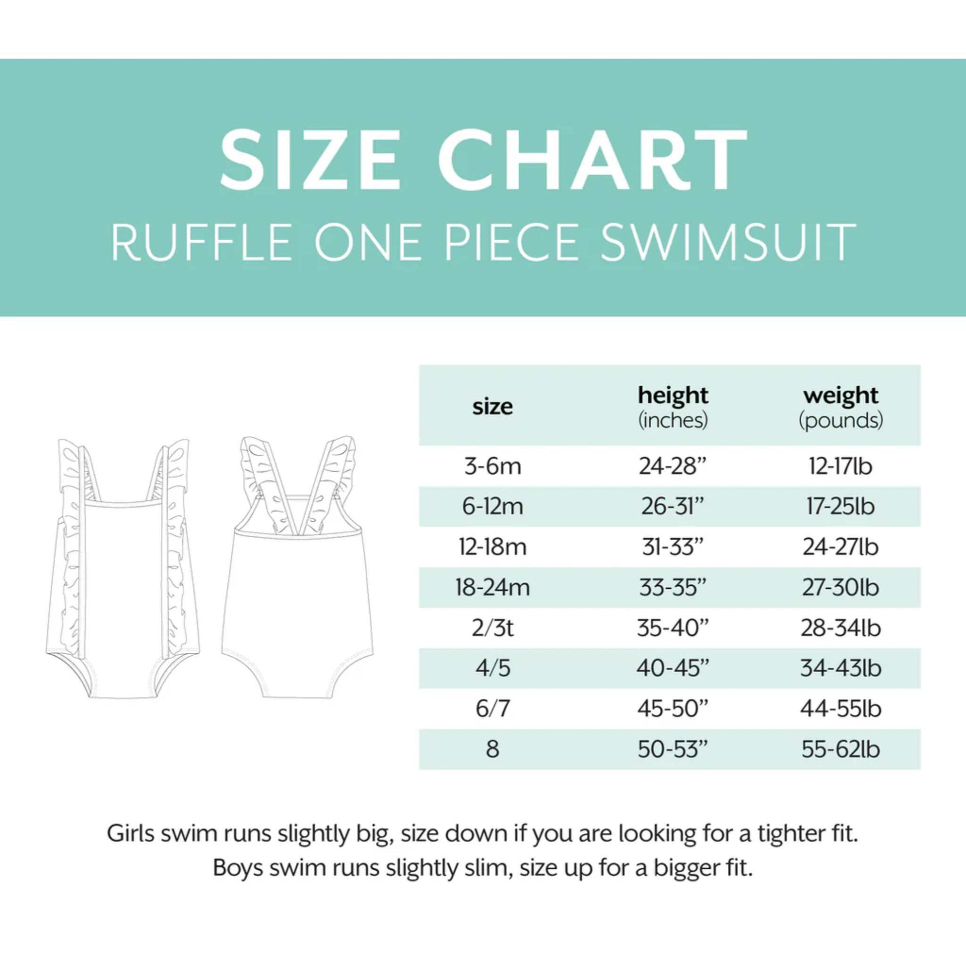 Enjoy the pool or beach in style! This one piece swimsuit is a must have for your little cutie. Ruffles down the front and back make for the best touch!