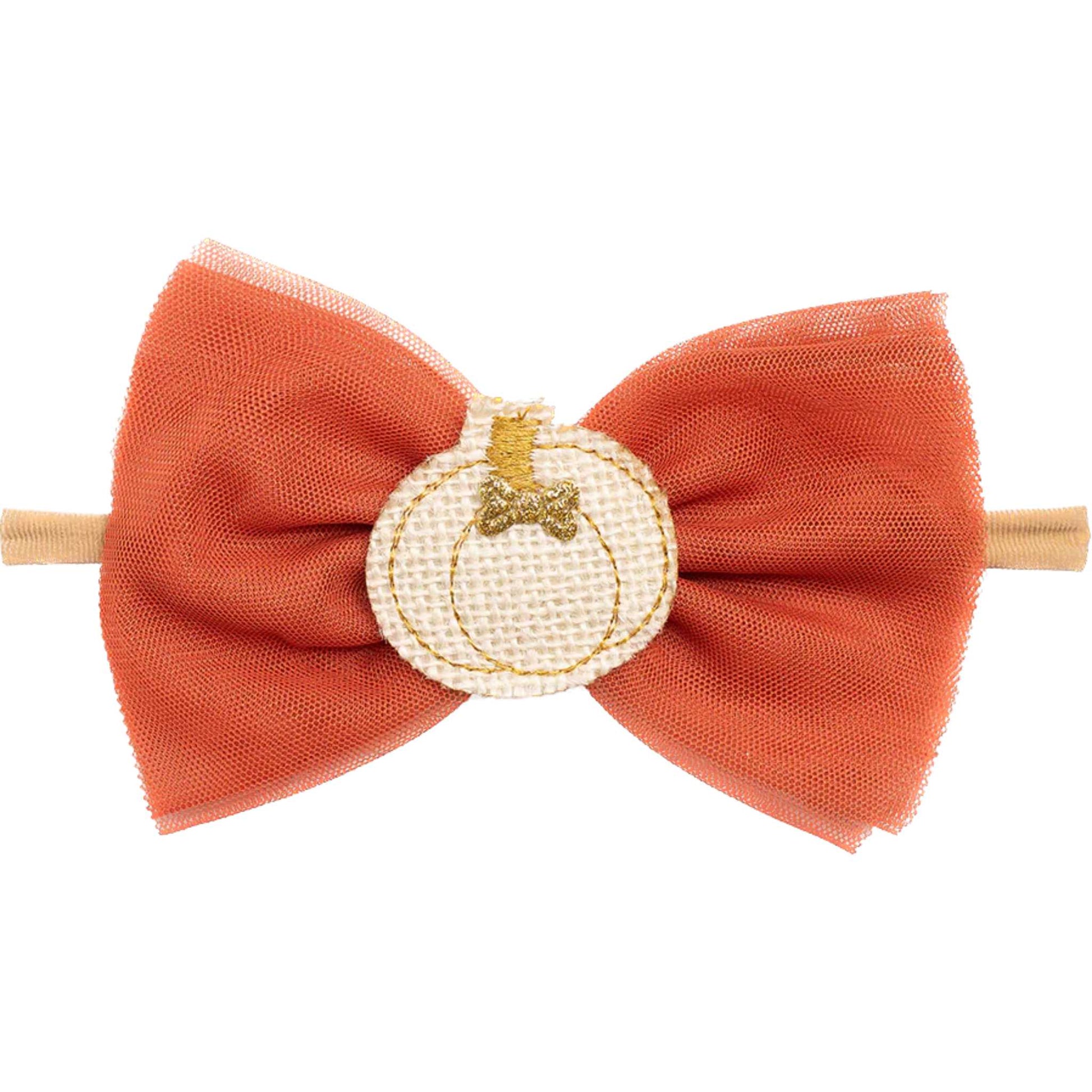 Has a natural colored elastic band accented with an orange tulle bow decorated with an ivory pumpkin that has a gold glitter bow accent. The stretch elastic ensures the headband fits comfortably on the baby’s head.