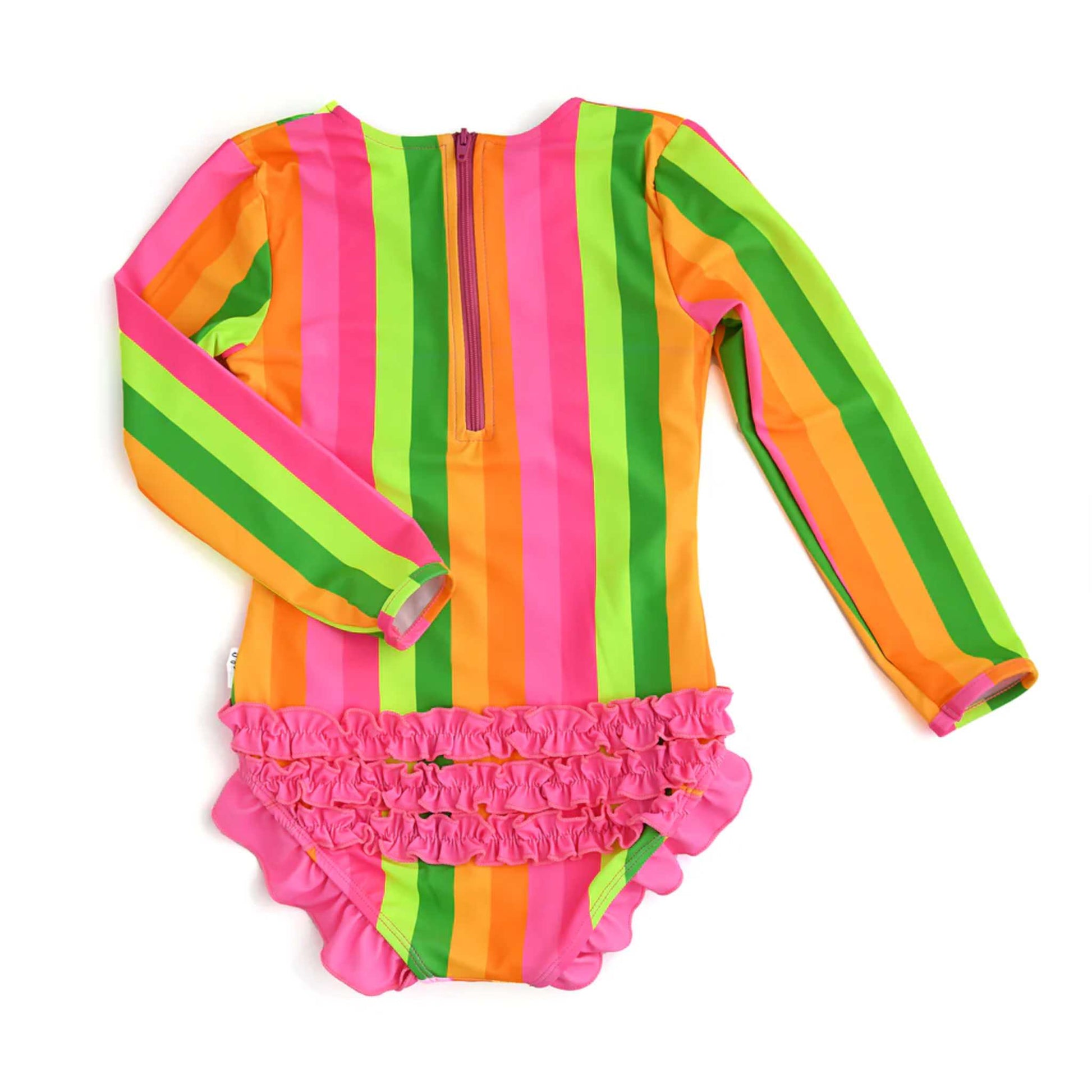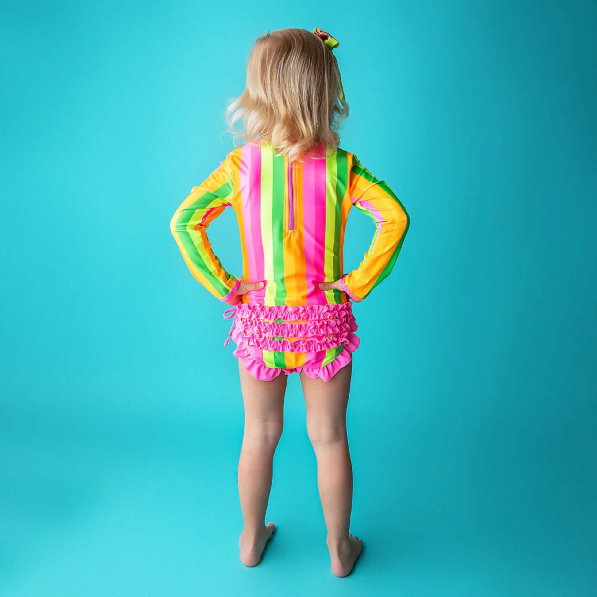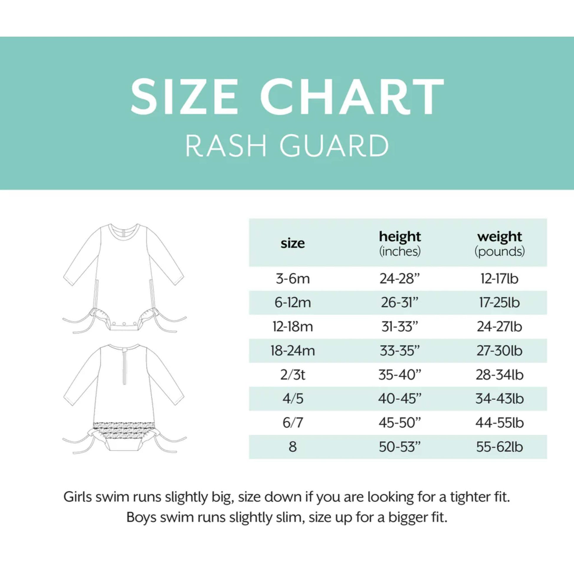 Long Sleeve Rash Guards are UPF 50 for sun safe play. Neon colors provide high visibility so you can spot your kiddos easily all summer long! Three functional snaps at the bottom of the suit in size 6m, 12m, 18m and 24m for easy diaper changes. Zipper along the back for easy on and off in all sizes. Adjustable ties at top of the leg opening can be tightened if needed.